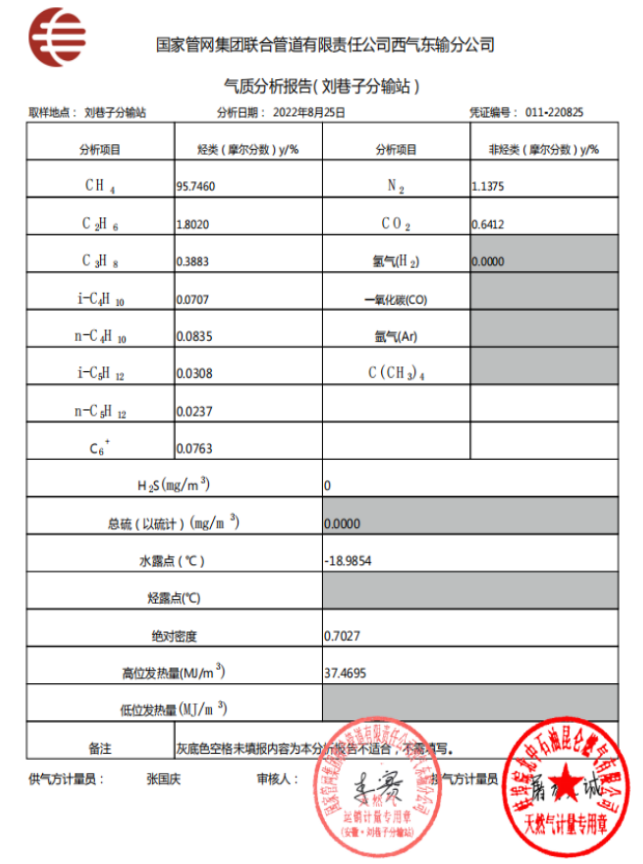 (1)高位发热量为37.4695MJ/m³,高于二类气标准31.4MJ/m³;